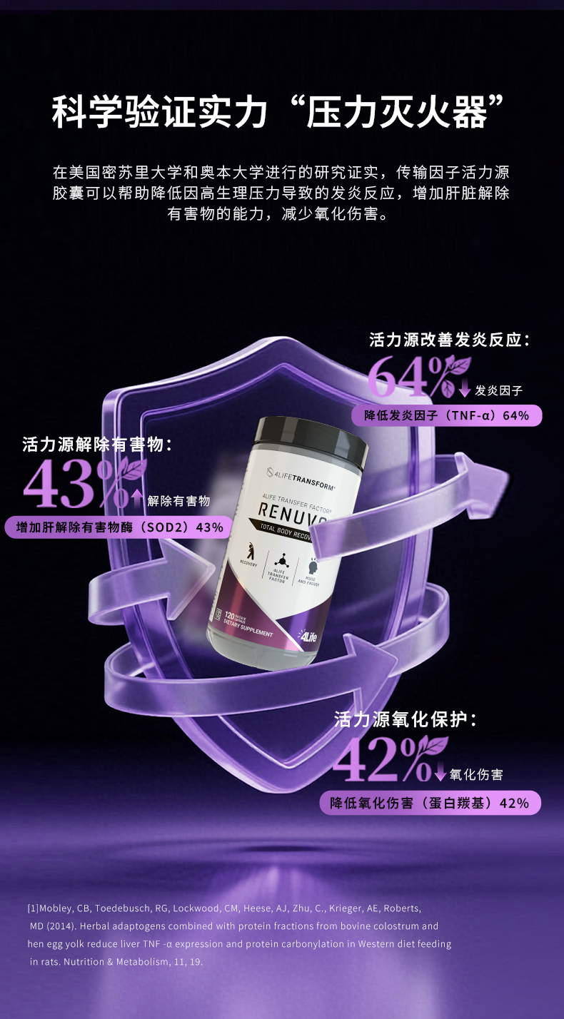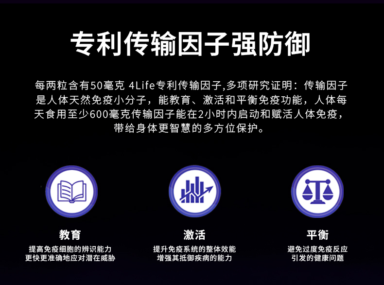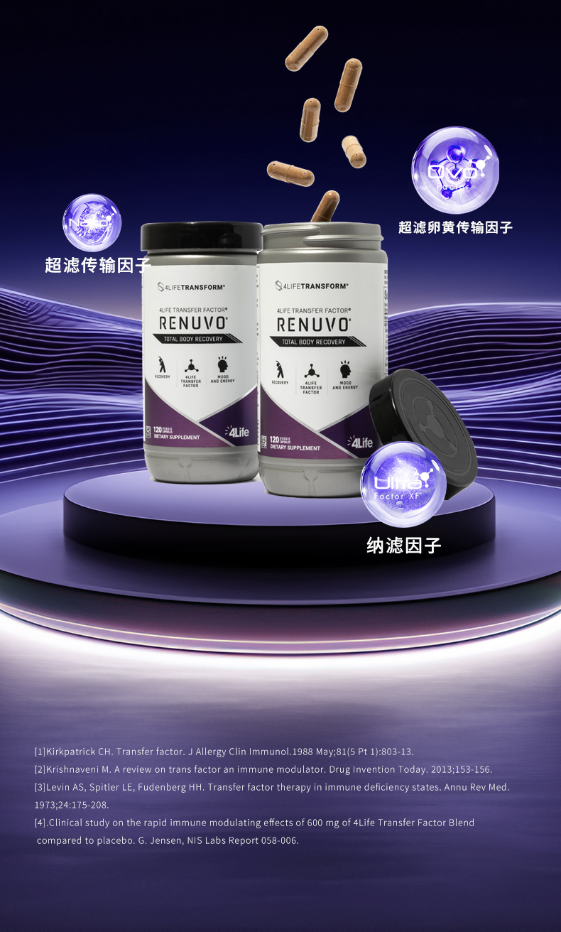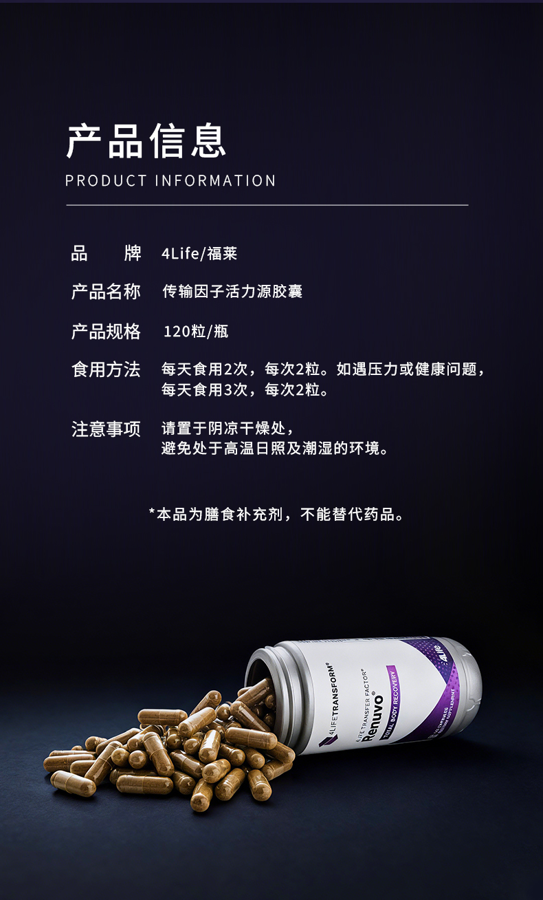 4Life 传输因子活力源胶囊采用生理调节配方,有助身体恢复并达到平衡状态,无惧生活中的各种生理负荷,充满年轻活力,健康应对。*本产品不可替代药品。