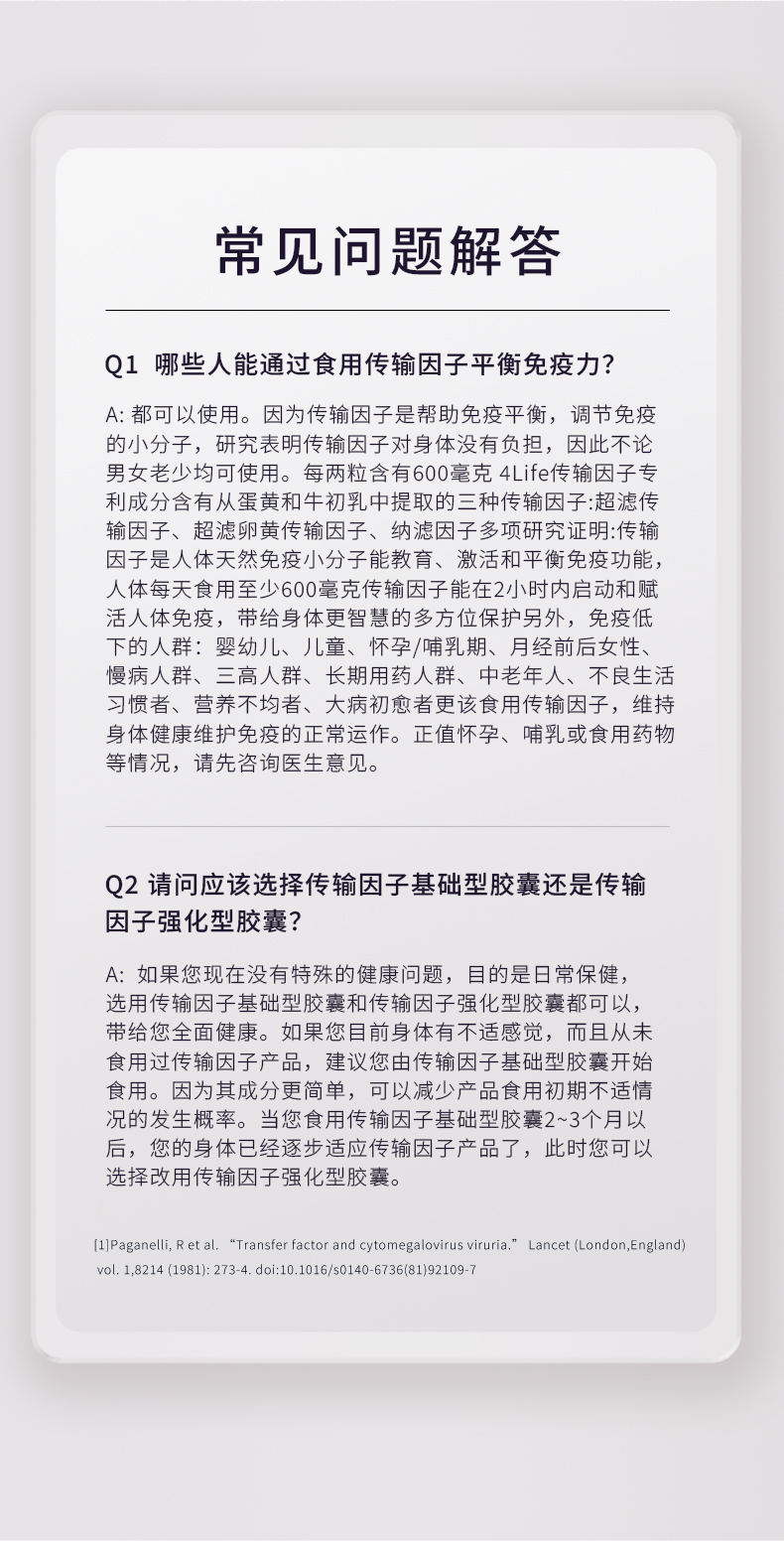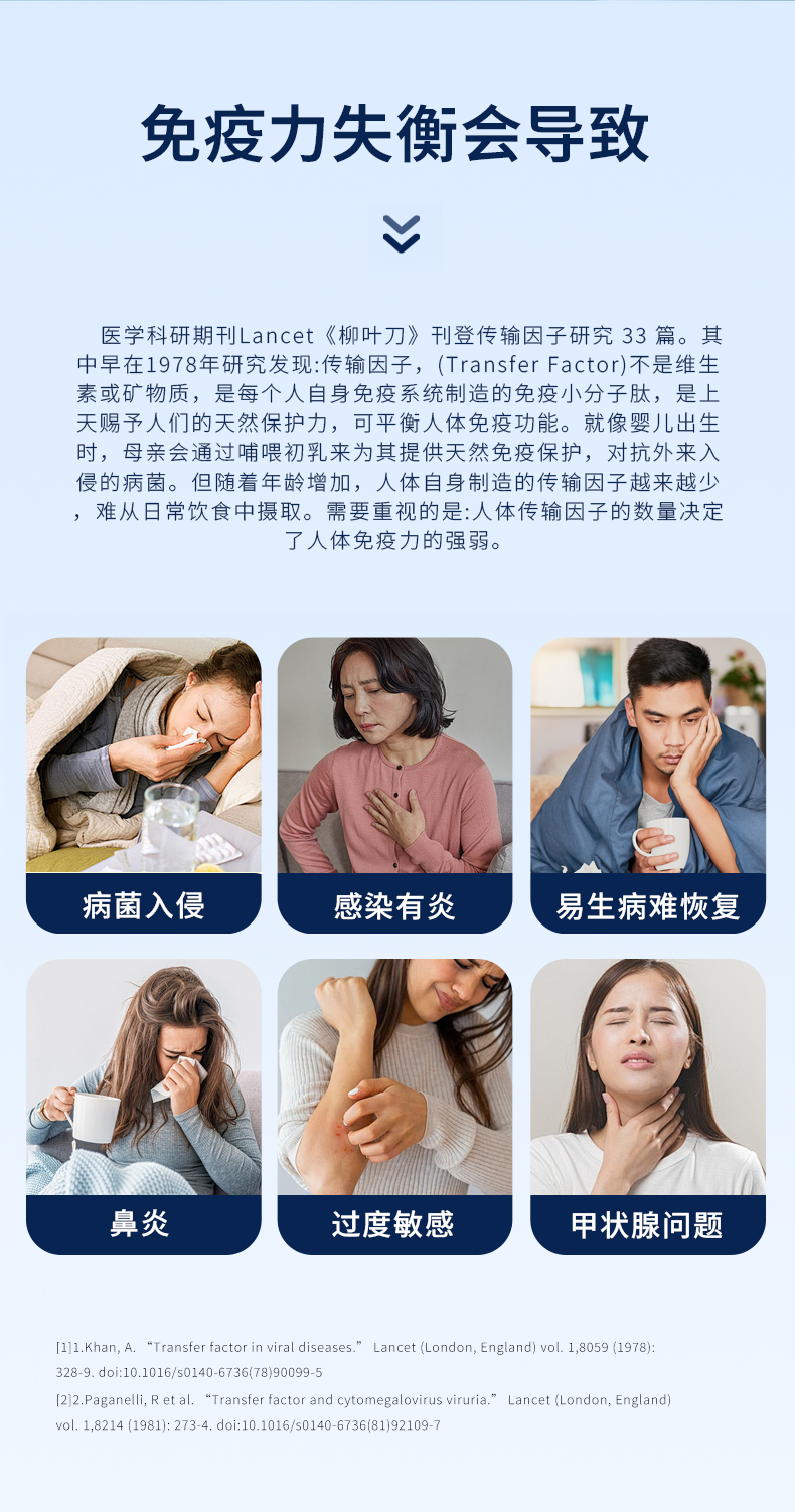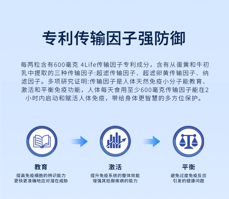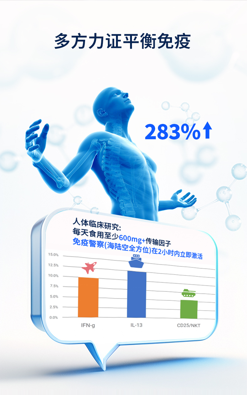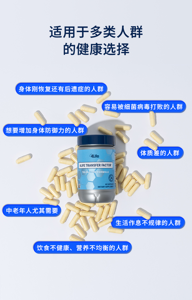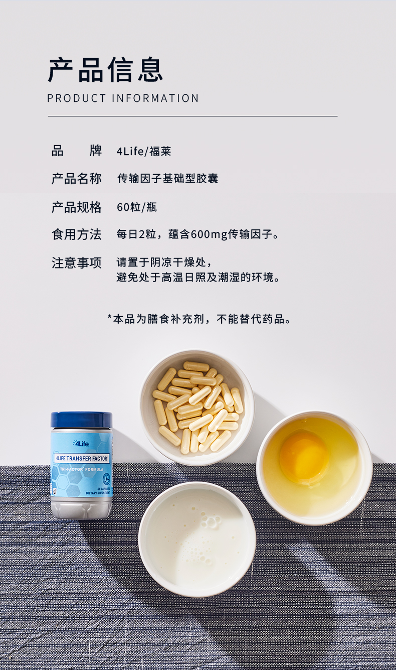传输因子胶囊有助于支持人体免疫系统功能,使免疫系统对机体潜在的威胁进行识别、反应及记忆。*本产品不可替代药品。